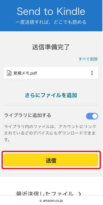ブラウザでSend to Kindle を開いて、ファイルを選択して送信するだけでアップロードが完了します。