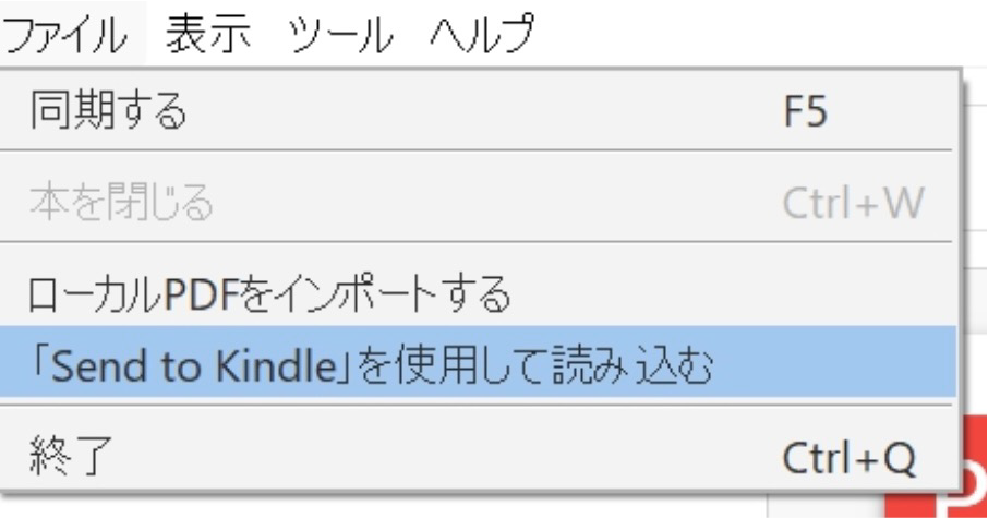 - 「ファイル」の「『Send to Kindle』を使用して読み込む」を選択